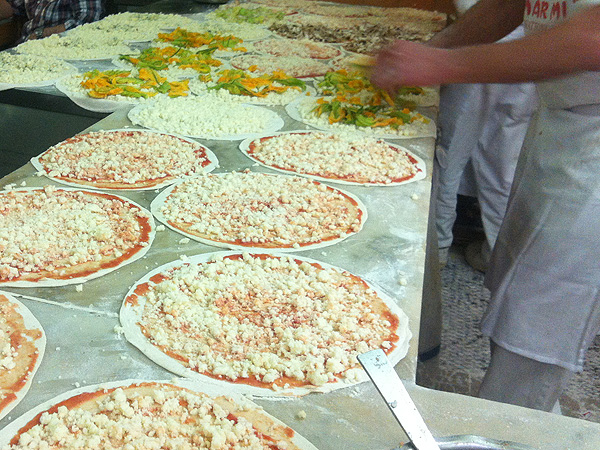 Glück gehabt! Wir haben noch einen Tisch bekommen und das mit Blick auf die drei Pizzabäcker, die ununterbrochen weiße Teigplatten mit Tomatensugo bestreichen, eine Handvoll Käse darauf verteilen und dann je nach Wunsch mit Zucchiniblüten (fior‘ di zucca), Oliven, Schinken und Champignons belegen.