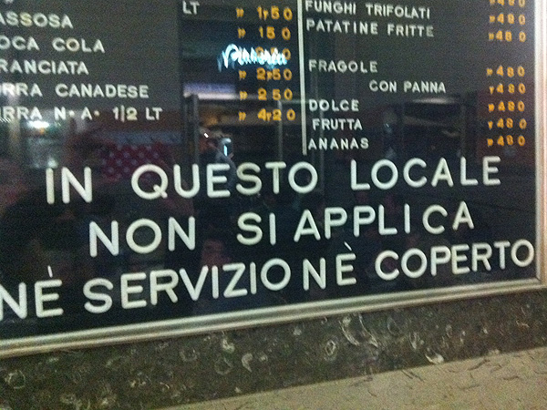 Was mir aber besonders gefällt, ist der Hinweis auf dem Schild an der Theke: „Hier verlangt man weder etwas für den Service noch für das Gedeck“.
