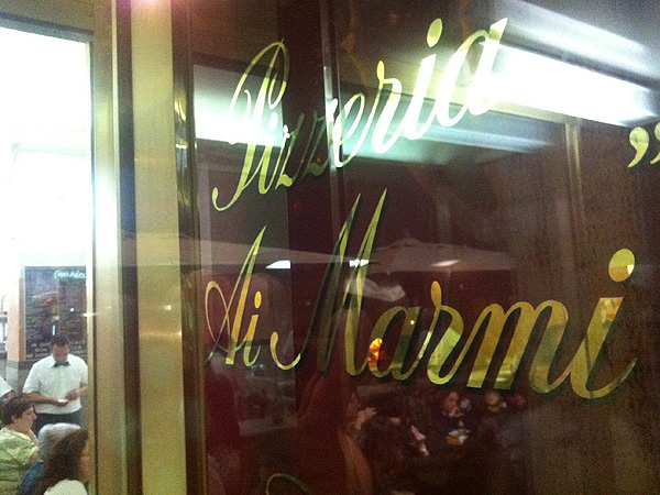 Der Gastraum ist derart schmucklos, dass selbst die Kleiderhaken an den Wänden wie Kunstobjekte erscheinen. Die einzige Dekoration sind die großen beleuchteten Plexiglastafeln mit dem Angebot über der Kasse. Die Gäste sitzen dichtgedrängt in langen Reihen an rechteckigen Tischen mit Marmorplatten (deshalb „Ai Marmi“).