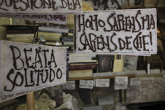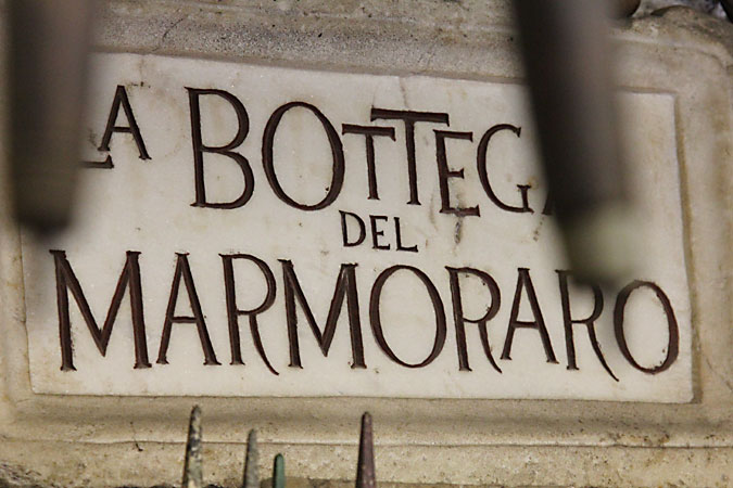 Die bottega del marmoraro ist ein Ort der Worte. Kleine Marmorplatten hängen von der Decke, liegen in einer Schale zusammen, angerichtet wie verlockende Pralinen, prangen an den Wänden, wollen vom Besucher entdeckt werden.